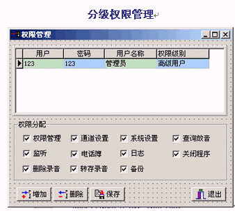 。。通話錄音或留言進行查詢管理,可按日期、時間、電話號碼、線路、通話長度、人員等條件對錄音進行快速檢索、播放,也可將錄音文件進行刪除、標記、轉(zhuǎn)存、備份等操作。分級權(quán)限管理