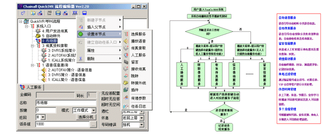 產(chǎn)品化、標(biāo)準(zhǔn)化、全功能、低價位,易于安裝使用,便于應(yīng)用集成,為用戶實(shí)現(xiàn)呼叫中心應(yīng)用節(jié)省了大量的資金、人力、時間;無需編程,可自定義呼叫服務(wù)流程,豐富的業(yè)務(wù)插件可以直接配置訪問后臺數(shù)據(jù)庫,滿足各類應(yīng)用需要;組件式構(gòu)造,易于擴(kuò)容和功能擴(kuò)展。