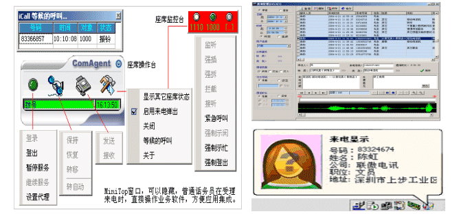 座席操作界面分類設(shè)計(jì)為Mini Top方式,可隨時隱藏或顯示;座席控件將來電號碼或在流程中收集的信息通過事件傳遞給業(yè)務(wù)系統(tǒng),話務(wù)員受理來電時,直接看到的是業(yè)務(wù)處理界面。