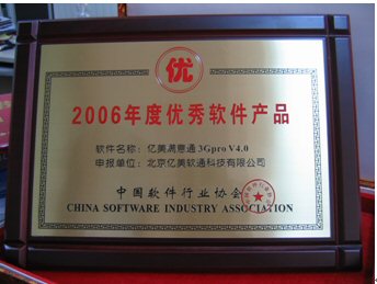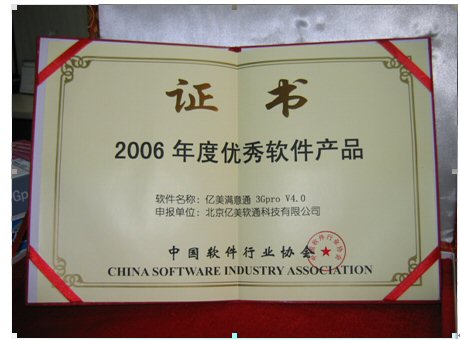 2006年1月18日,由中國軟件行業(yè)協(xié)會(huì)頒發(fā)的“2006年度推薦優(yōu)秀軟件產(chǎn)品”獎(jiǎng),經(jīng)過層層評(píng)審,終于浮出水面。北京億美軟通科技有限公司推薦的面向3G應(yīng)用的移動(dòng)商務(wù)產(chǎn)品——億美滿意通3Gpro憑借著不俗的表現(xiàn)喜獲殊榮。