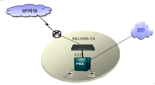 MG3000-T4提供1、2、4E1中繼,直接提供數(shù)字中繼口和PBX交換機(jī)對(duì)接,PBX交換機(jī)原有的撥號(hào)習(xí)慣和撥號(hào)方式不做改變,可以通過路由選擇的方式來走原來的PSTN網(wǎng)絡(luò)或者IP網(wǎng)絡(luò),同時(shí)通過MG3000-T4來做電路交換和IP網(wǎng)的分組交換的轉(zhuǎn)換,實(shí)現(xiàn)該分支機(jī)構(gòu)和其他分支機(jī)構(gòu)的互連互通。