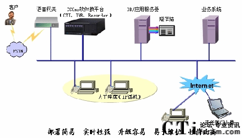 有沒(méi)有辦法讓數(shù)量占多數(shù)的中小集團(tuán)客戶(hù)也能享受IP呼叫中心的好處呢?在一個(gè)日益成熟的開(kāi)放市場(chǎng)中,答案是肯定的。目前已經(jīng)有國(guó)內(nèi)廠(chǎng)商針對(duì)這塊市場(chǎng)在進(jìn)行耕耘,我們可以看看國(guó)內(nèi)在這方面走在前列的廠(chǎng)商大唐高鴻新推出的針對(duì)中小企業(yè)的IP呼叫中心產(chǎn)品SS3000-C。SS3000-C,采用純IP技術(shù),利用先進(jìn)的軟交換技術(shù),系統(tǒng)可伸縮性極強(qiáng),可隨客戶(hù)需要進(jìn)行靈活建設(shè)。