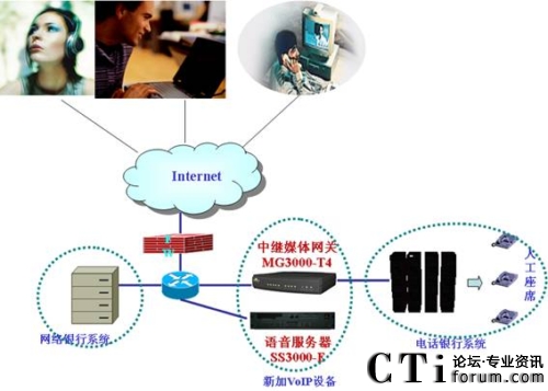 通過(guò)上述三環(huán)節(jié),Internet上的電話呼叫即可送入電話銀行的人工座席處,Internet上的客戶也就可以通過(guò)計(jì)算機(jī)上的耳麥和電話銀行座席人員通話。拓?fù)涫疽鈭D如下: