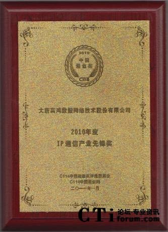 在評選工作中,通過專家評選以及廣大網(wǎng)友投票選舉,高鴻股份數(shù)據(jù)網(wǎng)絡(luò)技術(shù)股份有限公司(以下簡稱“高鴻股份”)憑借自身雄厚實力和優(yōu)良服務(wù),在2010年的工作得到了大家充分的肯定,喜獲 “IP通信產(chǎn)業(yè)先鋒獎”獎項。