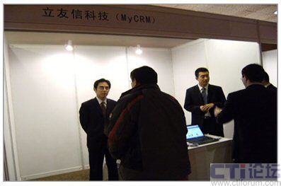 在隨會(huì)附設(shè)的展臺(tái)前,MyCRM更是受到不少參會(huì)企業(yè)的關(guān)注。圖為MyCRM咨詢顧問為參會(huì)企業(yè)家講解MyCRM系統(tǒng):
