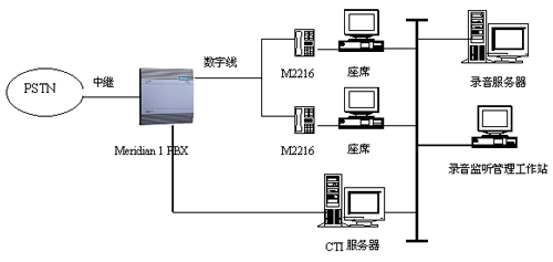 使用Meridian 2216 ACD數(shù)字話機上的錄音端口,直接接入PC機聲卡,進行錄音監(jiān)控。其物理結(jié)構(gòu)如下所示: