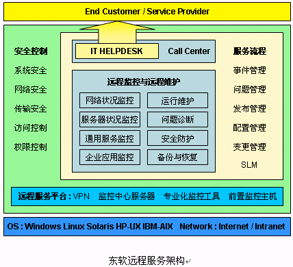 以東軟IT HELPDESK作為接入平臺(tái),結(jié)合基于VPN的遠(yuǎn)程監(jiān)控、遠(yuǎn)程維護(hù)技術(shù),遵照ITIL流程,為客戶(hù)提供及時(shí)、優(yōu)質(zhì)的服務(wù),達(dá)到降低服務(wù)成本、提高服務(wù)效率、改善客戶(hù)滿(mǎn)意度的目的。