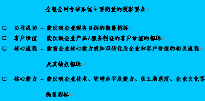 根據(jù)公司制定的策略目標(biāo),將平衡記分卡體系引入客戶服務(wù)的全程全網(wǎng)考核系統(tǒng)當(dāng)中,這一體系能比較全面和客觀地反映客戶關(guān)系中心的運營績效。完成整個全程全網(wǎng)考核系統(tǒng)設(shè)計的關(guān)鍵的成功因素為: