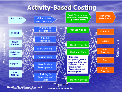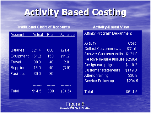 相關(guān)的是,使用傳統(tǒng)的成本和通過一種系統(tǒng)的合理的方式把該成本分配到各個行動上去。這是它們自身的科學(xué),如果你擁有數(shù)字的頭腦,你可以確定一個計(jì)劃,該計(jì)劃把企業(yè)的成本分配到圖6右手邊所示的不同的行動上去。這是一個關(guān)鍵的步驟。
