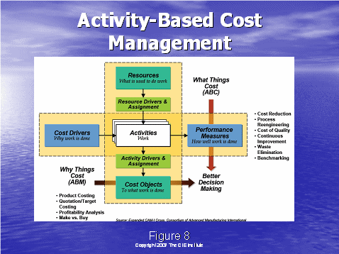 通過了解圖8,我們將以行動成本管理大體是什么的總括作為結(jié)束。我們從左邊的成本驅(qū)動因素開始——這是做工作的原因,例如:獲得客戶,維持客戶。就如圖4中所說的,這些成本驅(qū)動因素可以細(xì)分到工作行動上去?梢酝ㄟ^描述人,培訓(xùn),設(shè)備和技術(shù)資源來組成工作行動。資源驅(qū)動因素被用于分配這些企業(yè)成本到各個行動上去。下一步就是系統(tǒng)地確定行動驅(qū)動因素,分配行動成本到成本對象上去,這有利于決策的制定。例如,獲得一個客戶和維持一個客戶需要花費(fèi)多少的成本?