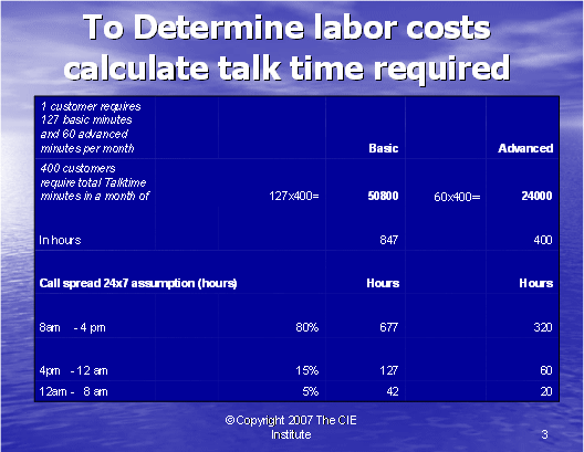 根據圖表12,我們可以算出第二種方式的利潤百分比。如果我們假設每個客戶每年的收入是20,000美元,其中分配給呼叫中心部門的收入是20%。我們每個客戶每月的收入是333.33美元,每個客戶月的成本是223.88美元(參見圖表10)。這導致我們來自每個客戶每月的利潤是109.46美元——這將產生33%的利潤率。