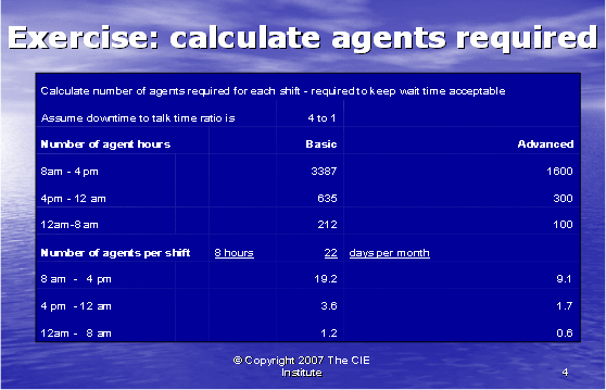在我們計算出所需的座席數(shù)之前,我們必須了解一個座席的付薪工作時間和他的通話時長的區(qū)別,通話時長是座席真正花在電話上面對客戶的時間。一個座席不會一直處理電話,其它的時間用于培訓,休息,與主管獨處,部門會議,公司內部為給客戶提供準確的回答而進行研究,對內對外寫郵件,準備下一個客戶的電話。在每個呼叫中心中,通話時長和停工時長的比率是不同的。對于復雜易變的產品,花在培訓上的時間會更多。在新產品被頻繁介紹的呼叫中心,就需要更多的時間去研究關于新產品的回答。為了更精確,一個座席一周的工作時長應該與其通話時長相比較,以便真正確定通話時長與停工時長的比率。在我們的例子中,我們假設停工時長和通話時長的比率為4:1,也就是說,每1小時通話時間,相對應4小時停工時間。