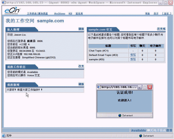 上圖是eQueue坐席員的標(biāo)準(zhǔn)工作界面,其中左側(cè)包含的信息有:坐席員個(gè)人資料、隸屬的坐席組、工作狀態(tài)、可服務(wù)的媒體類型、系統(tǒng)公告;右側(cè)有隊(duì)列中處于等待狀態(tài)的呼叫請求數(shù)量。界面上方設(shè)置有益昂公司特色的知識(shí)庫(KB)鏈接,單擊鏈接可以查找到客戶所關(guān)心問題的標(biāo)準(zhǔn)回復(fù)內(nèi)容。在這個(gè)界面里,坐席員可以完成包括語音呼叫、電子郵件在內(nèi)的所有工作。
