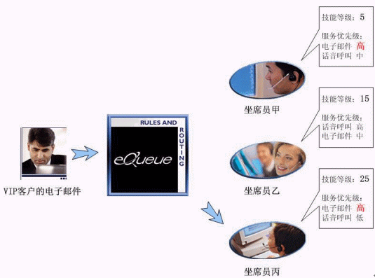 我們假設(shè)在某個(gè)聯(lián)絡(luò)中心里,有甲、乙、丙三位坐席員工作在同一個(gè)項(xiàng)目組(坐席組)。甲是新員工,只具有基本服務(wù)技能,經(jīng)驗(yàn)很有限;乙是一位擁有豐富經(jīng)驗(yàn)的坐席員,語音呼叫應(yīng)答技巧非常嫻熟,具有回復(fù)電子郵件的技能但是熟練程度略低于語音應(yīng)答技能;丙是一位經(jīng)驗(yàn)豐富、技能全面的坐席員,業(yè)務(wù)熟練,其最擅長的是回復(fù)客戶的電子郵件。假設(shè)有一位重要客戶發(fā)來電子郵件咨詢一個(gè)非常專業(yè)的技術(shù)問題。由于這是一位VIP客戶,服務(wù)條款中規(guī)定了他所有的呼叫請求都必須由經(jīng)驗(yàn)豐富的坐席員來響應(yīng)。在eQueue多媒體單一隊(duì)列中,他的電子郵件被限定為坐席員的技能只有達(dá)到或超過等級(jí)15才有資格回復(fù)。在3個(gè)坐席員中,甲因?yàn)榧寄艿燃?jí)只有5,不能滿足回復(fù)郵件的先決條件,雖然擁有此項(xiàng)技能且優(yōu)先級(jí)為高,依然沒有資格響應(yīng)這個(gè)聯(lián)絡(luò)請求;乙、丙的技能等級(jí)都滿足回復(fù)郵件的條件,但是丙的此項(xiàng)技能服務(wù)優(yōu)先級(jí)為高,因此,在丙坐席員處在可服務(wù)狀態(tài)下,eQueue會(huì)將此VIP客戶的電子郵件優(yōu)先派發(fā)給她。只有當(dāng)她處于忙碌狀態(tài)時(shí),才會(huì)派發(fā)給乙坐席員。