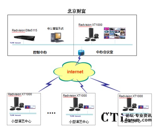 通過多次激烈的討論和無數(shù)次的論證,北京市財富中心領(lǐng)導最終決定通過打造一套高清視頻會議平臺系統(tǒng)來解決這一棘手的問題。財富中心的領(lǐng)導希望通過這套高清視頻會議平臺系統(tǒng)來提升全體員工的整體工作效率。該項目最終以RADVISION Elite MCU為多媒體通信平臺核心進行搭建,前期以多媒體會議室及演藝中心為主要接入點,通過RADVISION SCOPIA XT1000高清會議室終端來實現(xiàn)高清1080P的視音頻交互;同時,希望在后期的建設(shè)中,能夠通過固定電話、移動電話以及3G網(wǎng)絡(luò)的接入,來實現(xiàn)真正的多媒體統(tǒng)一通信。