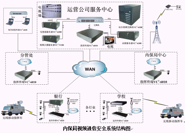 針對以上情況,北京華緯訊電信技術(shù)有限公司基于最新推出的VC3-6000綜合視頻通信平臺提出了針對性的"城市安保聯(lián)動視頻通信平臺"解決方案。該平臺整合多種資源,實現(xiàn)了視頻指揮調(diào)度、遠(yuǎn)程視頻監(jiān)控、視頻會議、視頻點播、無線移動視頻接入、高清晰圖片傳輸和環(huán)境監(jiān)測等功能。平臺組成如下圖:
