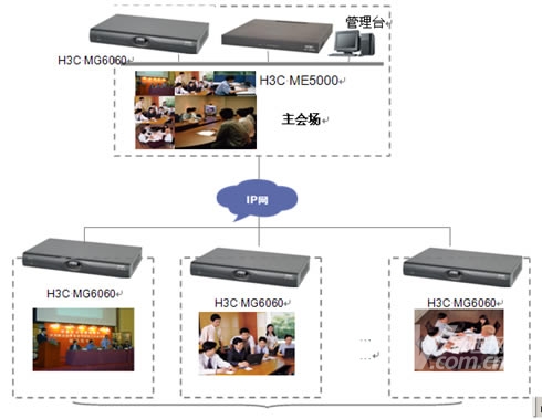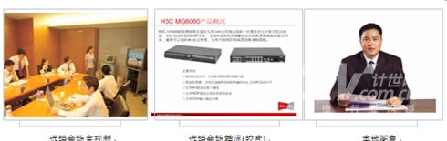 在主會(huì)場(chǎng),分會(huì)場(chǎng)的會(huì)議室配備H3C高清視訊終端MG6060。H3C MG6060終端支持H.263、H.264等視頻編解碼協(xié)議,并采用了專有的視頻前、后處理技術(shù),使得圖像質(zhì)量大大提升,在周圍環(huán)境光照較差或者會(huì)場(chǎng)顏色搭配不甚和諧的情況下,仍舊能夠得到清晰、自然的圖像。視頻功能主要特色功能包括動(dòng)態(tài)4CIF高清圖像、H.239雙視頻流傳送、畫中畫(PIP)、雙屏顯示、分屏顯示、VGA輸入、VGA輸出、桌面?zhèn)魉汀D像屏蔽、圖像參數(shù)調(diào)整等。有關(guān)H3C