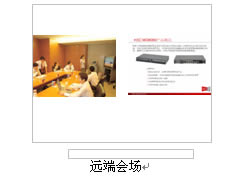對(duì)于很多分會(huì)場(chǎng)通常只有1臺(tái)顯示設(shè)備的情況,H3C公司的視訊終端提供在1臺(tái)顯示設(shè)備上同時(shí)顯示"遠(yuǎn)端的會(huì)場(chǎng)圖像+遠(yuǎn)端膠片+本地會(huì)場(chǎng)圖像",顯示模式可通過終端遙控器靈活選擇:遠(yuǎn)端圖像、遠(yuǎn)端膠片、遠(yuǎn)端圖像+遠(yuǎn)端膠片、,實(shí)際顯示效果如下圖所示: