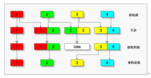 當(dāng)?shù)?個包在傳輸過程中丟失時,由于包“3”被冗余編碼到第4個傳輸包中,在對端接收到碼流后還可以正常重構(gòu)出包“3”。