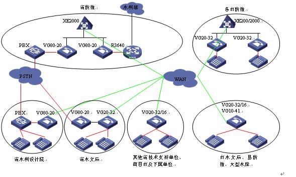 省水利設(shè)計(jì)院已經(jīng)部署了200門容量的PBX,采用語音網(wǎng)關(guān)將PBX及其下掛的模擬電話接入系統(tǒng)后,除了不需要連接水利部語音系統(tǒng)外,其組網(wǎng)與省防總完全一致,與省水利設(shè)計(jì)院連接的PBX可采用VG80-20,使用2個(gè)E1連接。