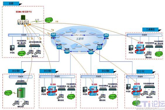 - 在該公司的數(shù)據(jù)中心架設(shè)一套Polylink的ECM軟交換系統(tǒng),統(tǒng)管全網(wǎng)。