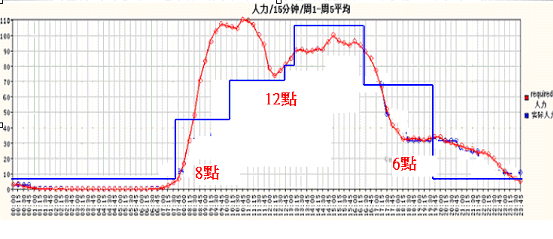 大家看到圖一中紅色的線,就是一天里面電話進(jìn)來的數(shù)量,藍(lán)色的線是安排的人力?梢郧宄吹剑涸缟8點一開始,電話就一直進(jìn)來;中午來電的客戶開始去吃飯,電話就開始下滑;然后等到客戶吃完中飯,電話又開始進(jìn)來,下午又出現(xiàn)另外一個高峰;一直到5點以后又開始下滑,6點以后電話相對就少很多。