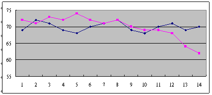 這是兩個呼叫中心從早上8點開始,一直到晚上6點,每隔半個小時的服務(wù)水平?梢院芮宄目吹,藍色這條線,它服務(wù)水平在91到48這中間震蕩,平均服務(wù)水平是73左右,粉紅色這條線,雖然平均服務(wù)水平也是在73左右,但震蕩幅度卻小了很多,服務(wù)水平只在81到68這中間震蕩。