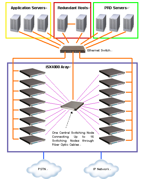下圖顯示了一個(gè)大容量iSX4000 UAP系統(tǒng),該系統(tǒng)由兩臺(tái)互為冗余備份的主機(jī)、三臺(tái)應(yīng)用服務(wù)器、三臺(tái)PRD服務(wù)器和一個(gè)由16臺(tái)iSX4000交換機(jī)和一臺(tái)中央交換節(jié)點(diǎn)構(gòu)成的iSX4000陣列構(gòu)成。交換陣列的16臺(tái)iSX4000交換機(jī)通過光纖和中央交換節(jié)點(diǎn)連接。中央交換節(jié)點(diǎn)提供系統(tǒng)跨節(jié)點(diǎn)交換能力。系統(tǒng)可同時(shí)提供最多31744