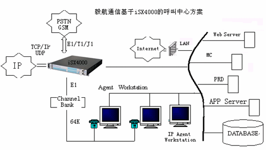 相對于現(xiàn)在的兩種主流呼叫中心方案,毅航通信基于iSX4000呼叫中心解決方案直接整合了Internet的接入。傳統(tǒng)由IVR完成的操作也可以通過Web頁面上的流程實現(xiàn),這樣用戶通過下拉菜單、簡單填寫、點擊按鈕等操作完成客戶識別、業(yè)務(wù)識別等操作,這些流程完成后,通過VoIP對呼叫中心呼入,由呼叫中心對呼入進(jìn)行受理,再按照相應(yīng)的原則分配到座席,座席再作相應(yīng)的應(yīng)答和處理,從而為客戶提供了一個通過Web站點直接進(jìn)入呼叫中心的途徑,把Internet所具有的豐富信息資源和強大的功能賦予呼叫中心,它向客戶提供一個可訪問的Web站點,使得呼叫中心從“撥叫到交談(Dial to Talk)”發(fā)展到“點擊到交談(Click to Talk)”,通過Internet可以提供IP電話語音呼叫、Call Back、IP傳真、IM、E-mail等功能,擴(kuò)展了通信渠道,一方面用戶可以實現(xiàn)免費接入到呼叫中心,另一方面企業(yè)能夠向更多的客戶提供優(yōu)質(zhì)、方便的服務(wù)資源,而且由于這些資源的價格相對傳統(tǒng)通信便宜,使企業(yè)為客戶提供全國、乃至于全球服務(wù)成為可能,提高了企業(yè)客戶服務(wù)水平,增強了企業(yè)競爭力。毅航通信統(tǒng)一呼叫中心解決方案系統(tǒng)結(jié)構(gòu)如圖所示: