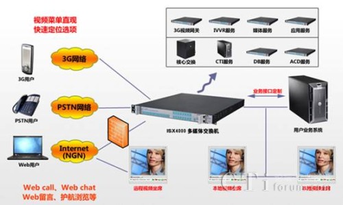 基于毅航通信ISX4000多媒體交換機(jī)的IVVR或視頻呼叫中心系統(tǒng)平臺可同時(shí)支持3G網(wǎng)絡(luò)、2G以及Internet網(wǎng)絡(luò)的接入;支持視頻、語音、傳真、郵件、短信等全方位服務(wù)模式;支持集中和IP分布式部署,座席數(shù)隨時(shí)隨地任意伸縮,可輕松形成一個跨區(qū)域、集語音和視頻于一體、統(tǒng)一的視頻呼叫中心系統(tǒng)。