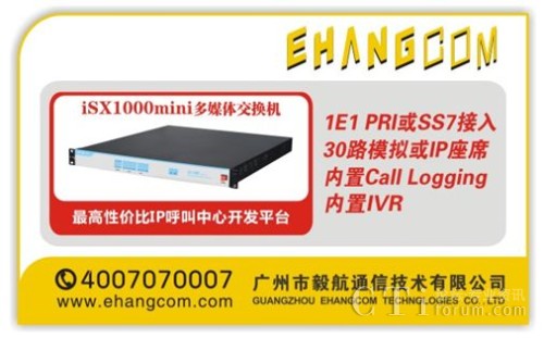 毅航通信為回饋社會(huì)各界朋友的關(guān)心與支持,加快中國中小企業(yè)呼叫中心產(chǎn)業(yè)化建設(shè),特推出作為最高性價(jià)比IP呼叫中心開發(fā)平臺(tái)的毅航iSX1000mini多媒體交換機(jī),1E1 PRI或SS7接入,30路模擬或IP座席,內(nèi)置IVR及Call Logging,價(jià)格優(yōu)惠。