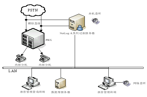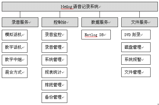 NetLog語音記錄系統(tǒng)采用基于分布式、多層控制管理體系的設(shè)計(jì)思想,將電話線路與內(nèi)部網(wǎng)絡(luò)有效地結(jié)合在一起,形成一套完整的語音記錄、管理系統(tǒng)。NetLog系統(tǒng)包括數(shù)據(jù)服務(wù)、文件服務(wù)、記錄服務(wù)、控制臺(tái);