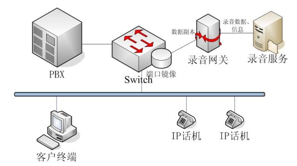 NETLOG VOIP語音記錄系統(tǒng)采用端口鏡像技術,在要錄音網絡的PBX上將所有的數(shù)據(jù)包生成一個副本,在不影響主線傳輸?shù)幕A上,把副本傳送到錄音網關RG(Record