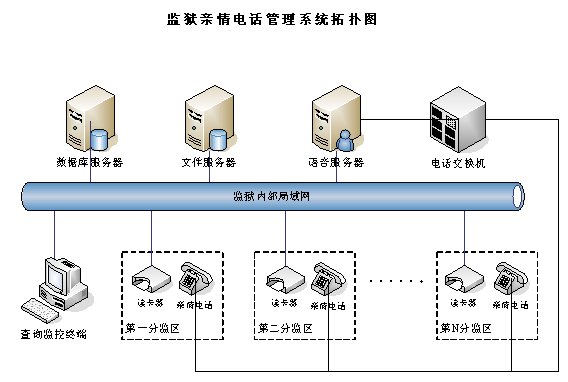 親情電話管理系統(tǒng)在系統(tǒng)設計中充分考慮監(jiān)獄的需求與特點,不但包含了一般親情電話錄音所需的全部功能,而且還融合了獄政管理的功能,整個系統(tǒng)采用集中式方式,在中心機房部署一套親情電話錄音服務器,各個監(jiān)區(qū)監(jiān)控系統(tǒng)利用監(jiān)獄內(nèi)部的局域網(wǎng)聯(lián)結成一個整體,形成一個能監(jiān)控監(jiān)獄親情電話的全網(wǎng)。這樣即可以在每個監(jiān)區(qū)監(jiān)聽,也可以在監(jiān)獄內(nèi)部網(wǎng)的任何地方對親情電話進行全程監(jiān)視。該系統(tǒng)能夠完全滿足目前監(jiān)獄的需求,產(chǎn)品性價比遠遠高于市場上其他同類產(chǎn)品。