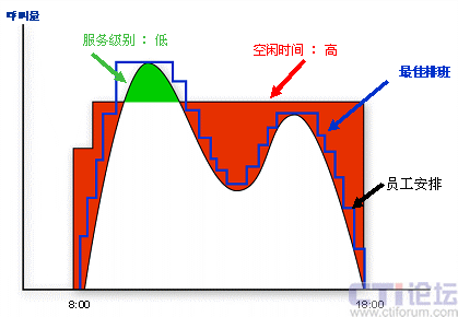 如果僅僅是工作量大,我想排班員還能夠忍受,更要命的是,排出的班表不能做到精確。要么人員太多,導(dǎo)致運營成本上升;要么人員不夠,無法達到預(yù)期的服務(wù)目標。以呼叫中心典型的雙峰曲線為例(如右圖),排班所追求的是人力安排和話務(wù)曲線的盡可能吻合(也就是圖中藍色的最佳排班線),達到在滿足服務(wù)水平的基礎(chǔ)上盡可能少的安排座席資源。而在手工排班中,由于大量的采用組排班,組中成員同時上下班、同時午餐,導(dǎo)致人力安排的靈活性降低,不能盡可能的去擬合話務(wù)曲線。此外,參考前面談到的影響人力安排的因素,手工排班中考慮了環(huán)境的影響,部分考慮了縮減,但座席技能因素考慮很少,基本認為所有人員的技能熟練度一致,不可預(yù)見性縮減也沒有考慮進去,導(dǎo)致最終會對服務(wù)水平造成負面影響。因此,手工排班是一種粗放型的排班方式,隨著運營要求的提高,表現(xiàn)出一定的不適應(yīng)性。