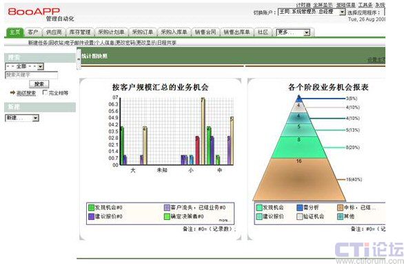 1.800CRM是一個(gè)完成系統(tǒng)的銷(xiāo)售一體化方案:幫助企業(yè)控制用戶資源,強(qiáng)化銷(xiāo)售執(zhí)行,其隨需定制的客戶管理、多渠道客戶互動(dòng)、全面的銷(xiāo)售統(tǒng)計(jì),決策系統(tǒng)的完備都遠(yuǎn)優(yōu)于其他同類(lèi)產(chǎn)品。800CRM保持800APP系列產(chǎn)品一貫的簡(jiǎn)單靈活、可個(gè)性化定制的頁(yè)面,設(shè)計(jì)流程清晰,在功能方面支持包括短信、傳真、郵件、即時(shí)通訊等多種與客戶溝通工具,國(guó)際化標(biāo)準(zhǔn)的客戶服務(wù)流程及工具,配有完整的自動(dòng)化統(tǒng)計(jì)分析功能,還有專(zhuān)業(yè)的項(xiàng)目管理及解決方案,支持超過(guò)十層以上的權(quán)限設(shè)計(jì),還可隨意定制復(fù)雜的審批流程。