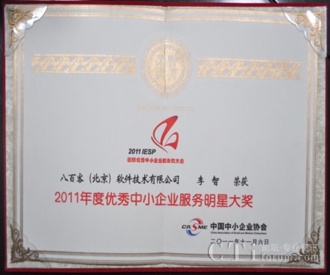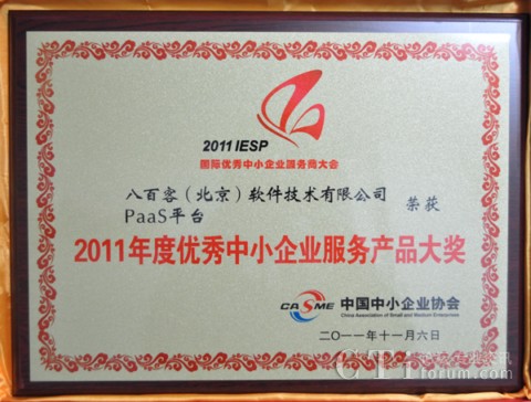 作為國(guó)內(nèi)首家SaaS廠商,八百客積極推動(dòng)云計(jì)算在中小企業(yè)中的宣傳與運(yùn)用。2006年,八百客在國(guó)內(nèi)率先推出管理自動(dòng)化開(kāi)發(fā)平臺(tái)800APP, 它擴(kuò)展了按需服務(wù),并實(shí)現(xiàn)了客戶(hù)可根據(jù)需要自定制應(yīng)用程序,成為了改變應(yīng)用程序開(kāi)發(fā)的一個(gè)新途徑。為表彰八百客在中小企業(yè)信息化中做出的杰出貢獻(xiàn),本次大會(huì)特別為八百客頒發(fā)了“2011年度優(yōu)秀中小企業(yè)服務(wù)產(chǎn)品大獎(jiǎng)”,此外還授予八百客總經(jīng)理李智 “2011年度優(yōu)秀中小企業(yè)服務(wù)明星大獎(jiǎng)”。