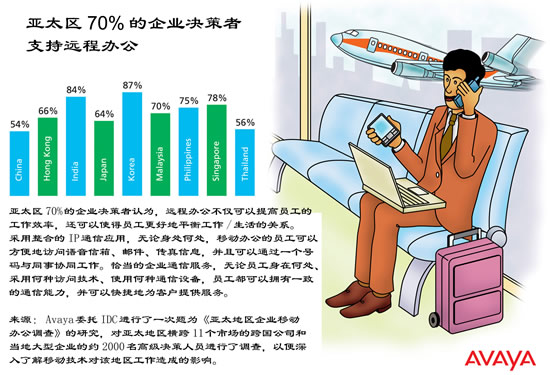 全球領(lǐng)先的企業(yè)通信軟件、系統(tǒng)和服務(wù)供應(yīng)商Avaya公司(紐約證券交易所上市代碼:AV)近日公布了針對整個亞太地區(qū)關(guān)于遠程辦公的調(diào)查報告,結(jié)果表明,亞太地區(qū)70%的企業(yè)高層管理者支持員工遠程辦公,認(rèn)為可以有效地提高員工的工作效率,進而提高企業(yè)的競爭優(yōu)勢。