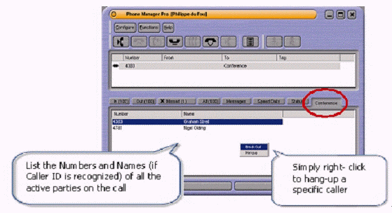 Office Phone Manager, 會議的發(fā)起者可以控制:每個與會者主被叫號碼(如果有姓名識別則會顯示姓名)會在Conference
