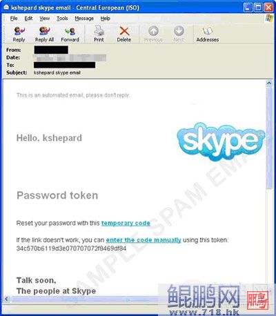 訊息中的連結(jié)雖然已經(jīng)關(guān)閉了,但一如預(yù)料地并不會(huì)進(jìn)入到合法的Skype網(wǎng)頁。