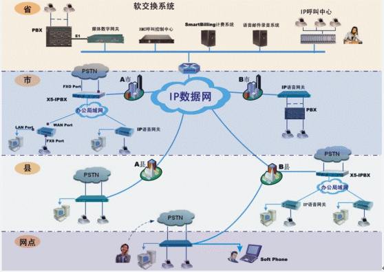 在各級(jí)辦公機(jī)構(gòu)根據(jù)原有用戶數(shù)量,可以配置IP電話綜合接入設(shè)備或IP-PBX,連接當(dāng)?shù)卦械霓k公電話環(huán)境(程控電話交換機(jī)、直線市話、電信虛擬網(wǎng)等)。實(shí)現(xiàn)機(jī)構(gòu)內(nèi)部辦公電話/傳真通過(guò)IP數(shù)據(jù)網(wǎng)通信。同時(shí)機(jī)構(gòu)以外的長(zhǎng)途電話/傳真也可以利用IP電話網(wǎng)傳輸,而不產(chǎn)生任何長(zhǎng)途通信費(fèi)用。