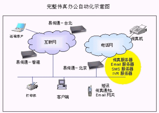 分布在異地的易傳通 網(wǎng)絡傳真服務器可以進行互連,傳真可以通過IP智能路由,從而節(jié)省了長途費用。