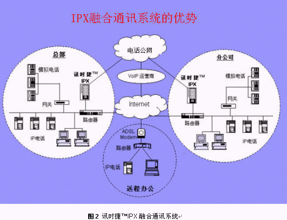 將訊時(shí)捷?IPX放在公司總部,其它分支機(jī)構(gòu)可以通過(guò)IP話機(jī),軟電話或者網(wǎng)關(guān)設(shè)備登錄到總部的IPX上,這樣就形成了整個(gè)公司的VOIP網(wǎng),建立了企業(yè)自己的通訊平臺(tái)。