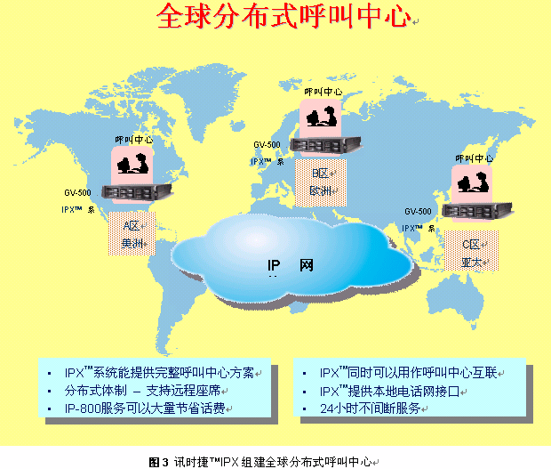 ③ 全球IP呼叫中心(參見(jiàn)圖3)