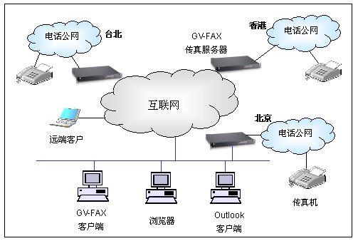 GV-FAX網(wǎng)絡(luò)傳真服務(wù)器IP傳真拓普圖如下所示,以某集團有三家分公司,分布在北京、臺北和香港三地為例: