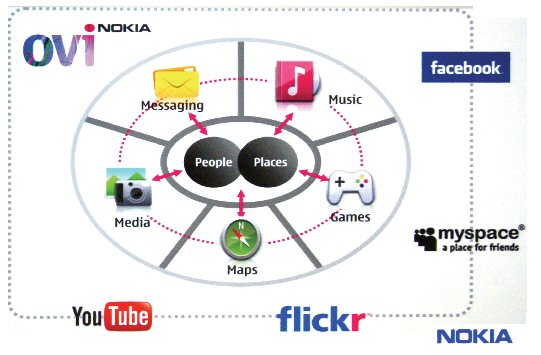 Tero_Ojanpera闡述,地圖、音樂、游戲、媒體視頻、訊息,是諾基亞鎖定的5大應(yīng)用業(yè)務(wù)領(lǐng)域。其中,數(shù)字地圖是手機(jī)導(dǎo)航服務(wù)的重要組成部分,也是用戶使用最多的功能服務(wù)。這5大業(yè)務(wù)是有機(jī)聯(lián)系而不是相互割裂的,以后可能將融合成一種服務(wù)。比如,你到達(dá)某地將手機(jī)中的數(shù)字地圖打開后,就能知曉附近跟你興趣相同的人,他可能會(huì)跟你分享一些你所喜愛的音樂,或向你推送跟你所在地相關(guān)的音樂,也可能與你分享一些與你相關(guān)的個(gè)性化媒體內(nèi)容和訊息。所以,各項(xiàng)服務(wù)是彼此包容、難分伯仲的。