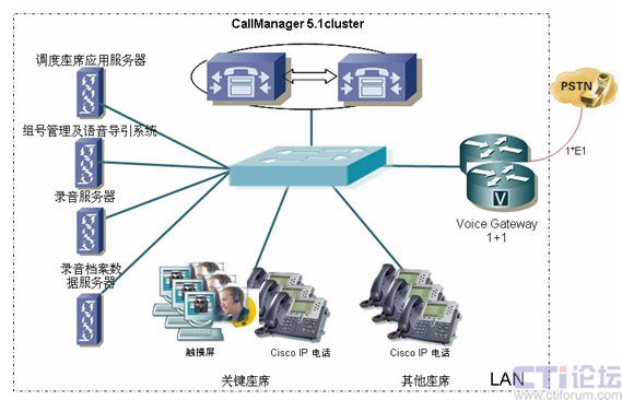 正音科技電話控制調(diào)度系統(tǒng)充分利用現(xiàn)有首都機(jī)場(chǎng)的IP網(wǎng)絡(luò)及通信資源,以IP電話系統(tǒng)為基礎(chǔ),構(gòu)建電話調(diào)度系統(tǒng)基礎(chǔ)網(wǎng)絡(luò)。電話控制系統(tǒng)主要由兩部分組成,其中包括由CallManager、語音網(wǎng)關(guān)、IP電話構(gòu)成的底層IP通信系統(tǒng);在此基礎(chǔ)上,還有正音科技為首都國際機(jī)場(chǎng)開發(fā)的電話調(diào)度控制應(yīng)用軟件系統(tǒng)以及與應(yīng)急救援警示系統(tǒng)等集成的接口。