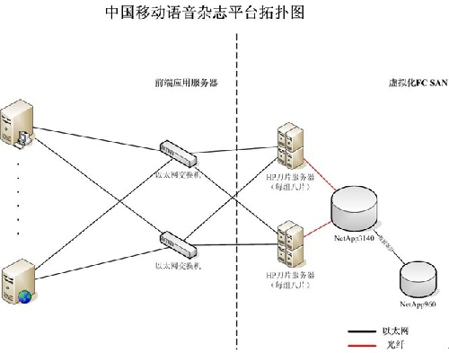 其中,NetApp FAS3140 配有 6 個 450GB 的 FC 磁盤和兩個 300GB FC 磁盤,裸容量為 46TB,用于運行中國移動的語音雜志業(yè)務,采用 Socket 連接。NetApp FAS2050 則內(nèi)置有 12 塊1TB SATA 磁盤,裸容量為 12TB,主要用于測試高陽公司 Oracle 數(shù)據(jù)庫和網(wǎng)站應用等。