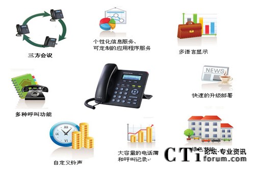 - 用戶自定義鈴聲,SRTP,SIP over TLS,支持多種語言和XML,支持個性化的信息服務、可定制的應用程序服務支持和多語言顯示(例如:本地天氣等)。