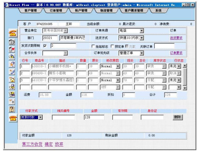 客戶根據(jù)麥考林提供的產(chǎn)品目錄告訴座席代表所需的產(chǎn)品和數(shù)量,并說明送貨方式、付款方式等信息,CRM軟件會自動計算客戶的消費金額,如果是老客戶或增在進(jìn)行促銷活動,軟件會自動計算相應(yīng)的折扣。如果某種產(chǎn)品缺貨,系統(tǒng)將告訴座席代表,并提供最近到貨日期供客戶參考。購買麥考林的許多商品,會有一些小禮品贈送,CRM軟件會根據(jù)客戶訂單列出客戶可以選擇的小禮品供客戶選擇。訂單輸入完成后進(jìn)行訂單入庫操作,并根據(jù)訂單的屬性自動生成相關(guān)工單派發(fā)有關(guān)部門。